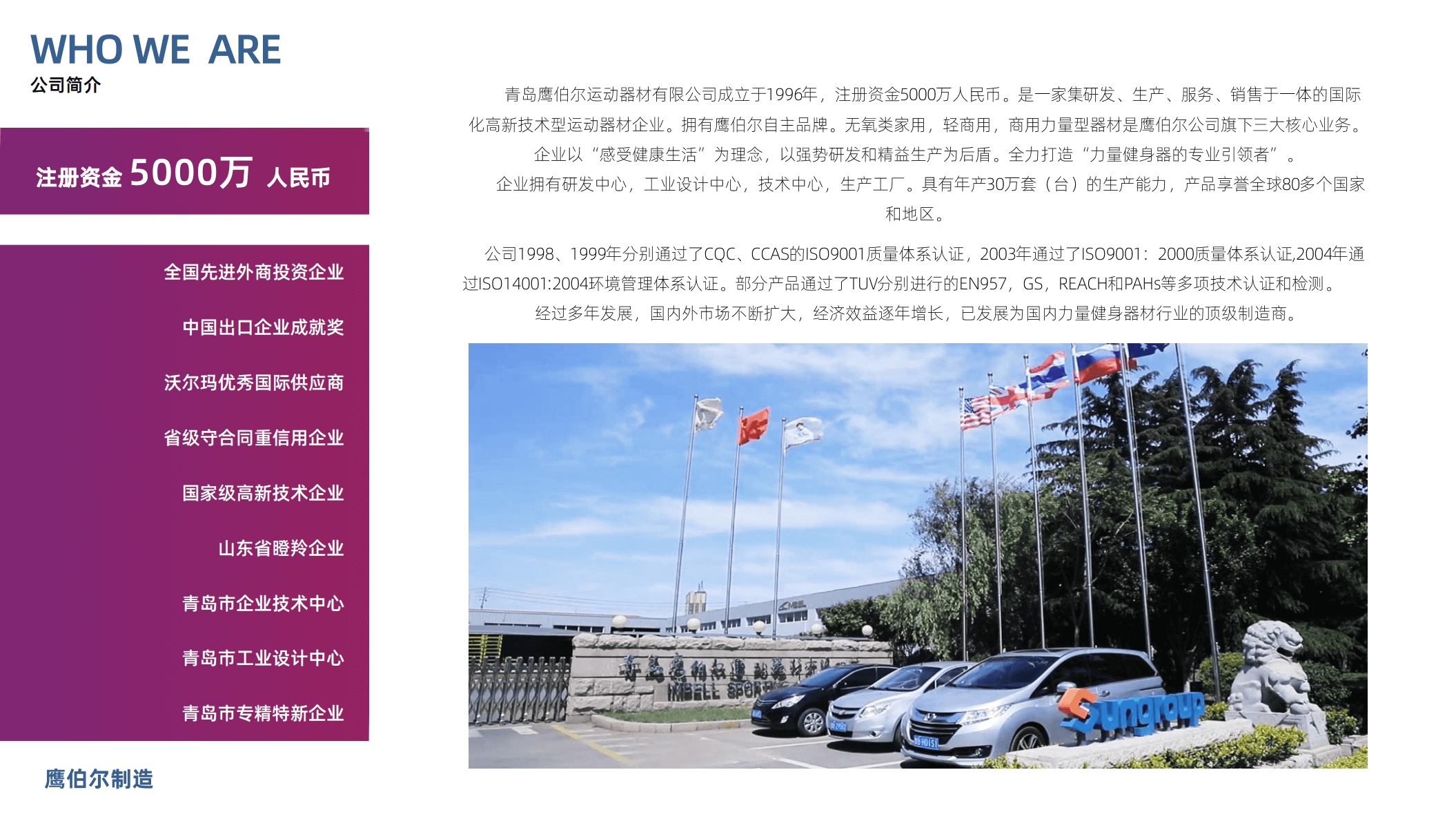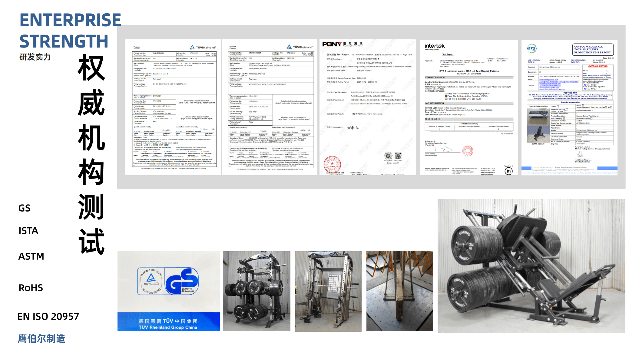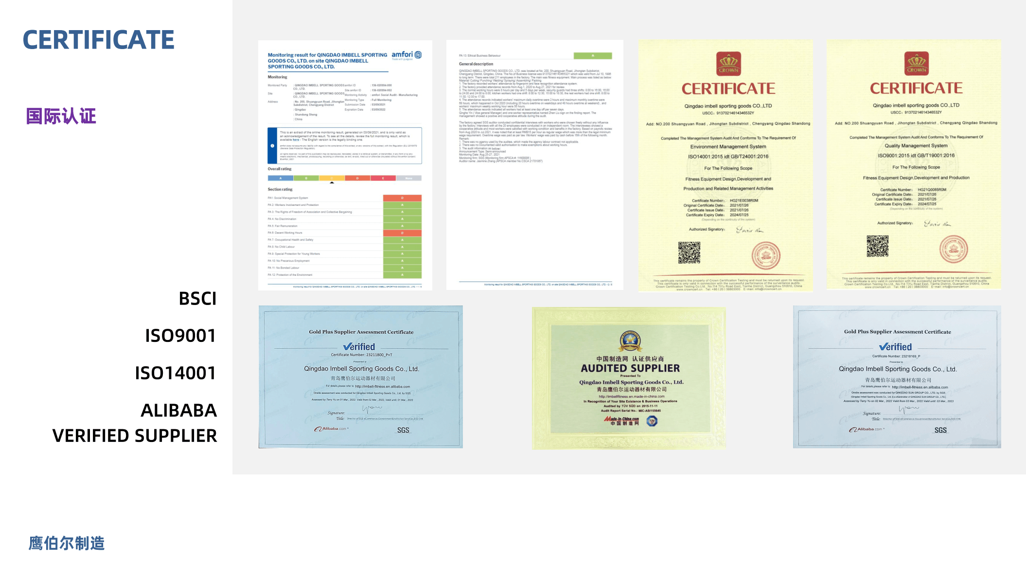 认证证书:ISO9001、ISO14001 部分产品通过了EN957、GS、REACH、PAHs认证、国家级高新技术企业、山东省瞪羚企业、青岛企业技术中心、青岛工业设计中心等证书