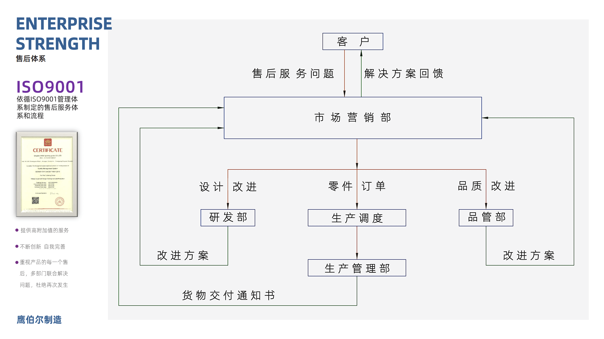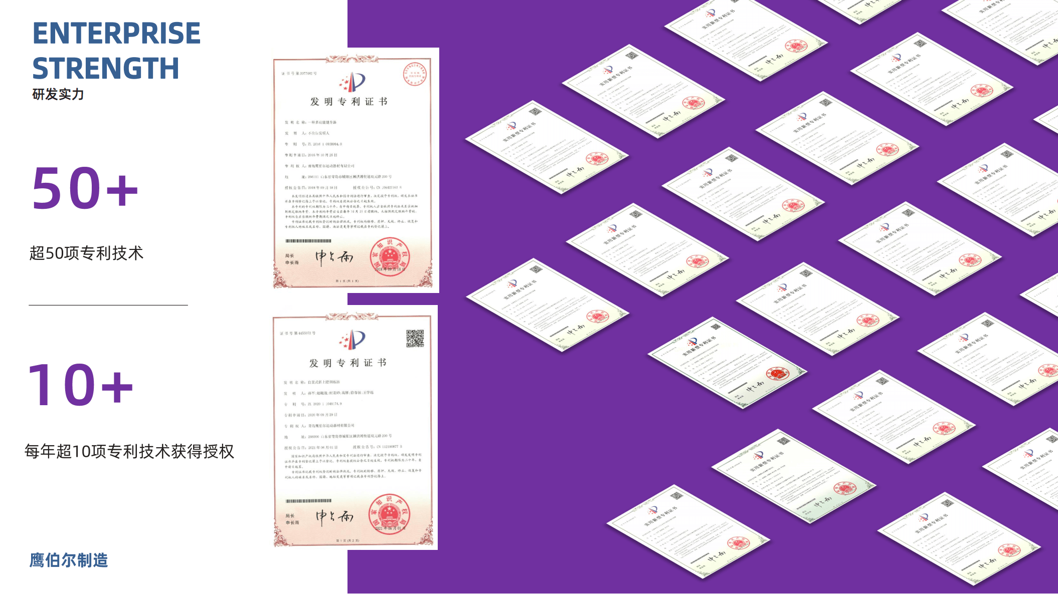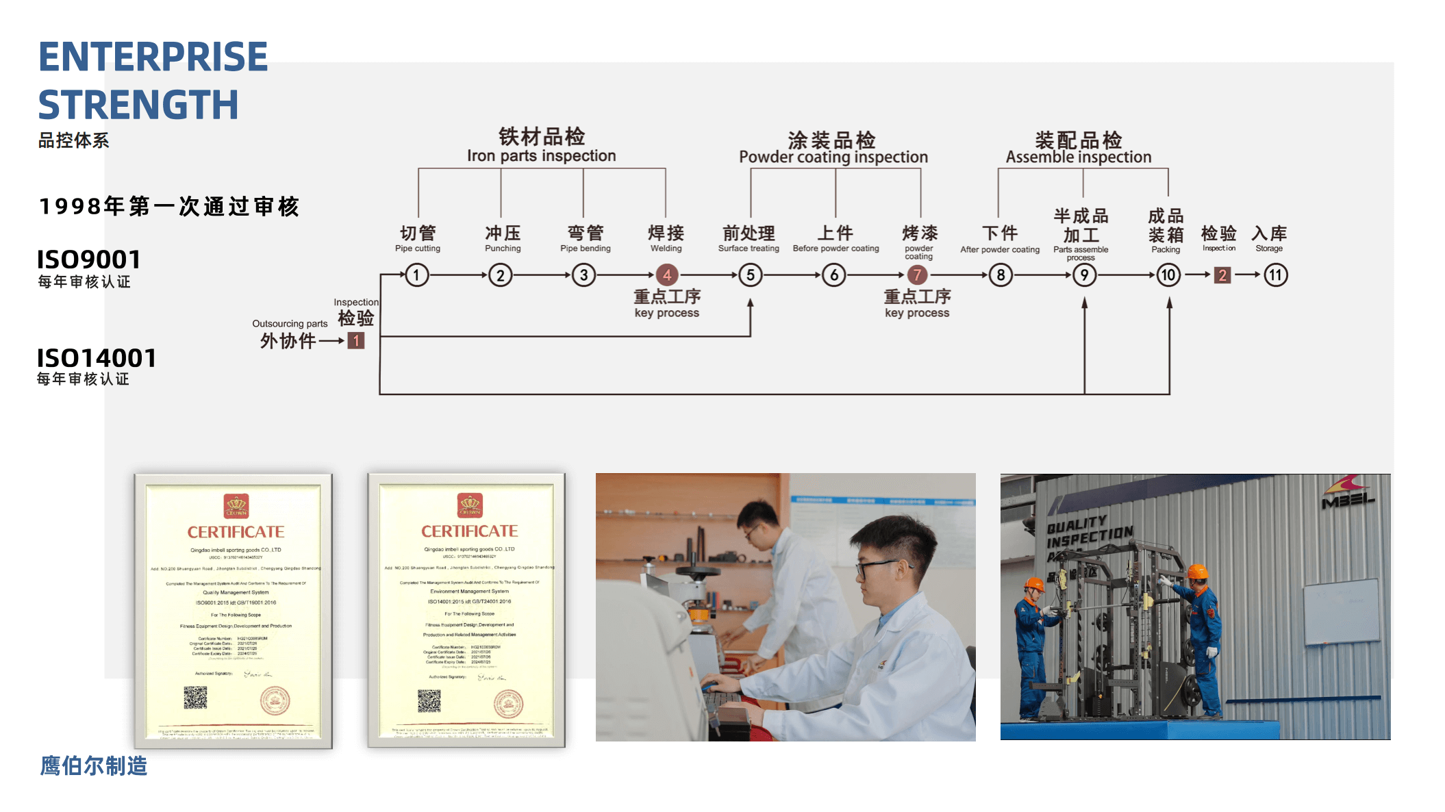 认证证书:ISO9001、ISO14001 部分产品通过了EN957、GS、REACH、PAHs认证、国家级高新技术企业、山东省瞪羚企业、青岛企业技术中心、青岛工业设计中心等证书