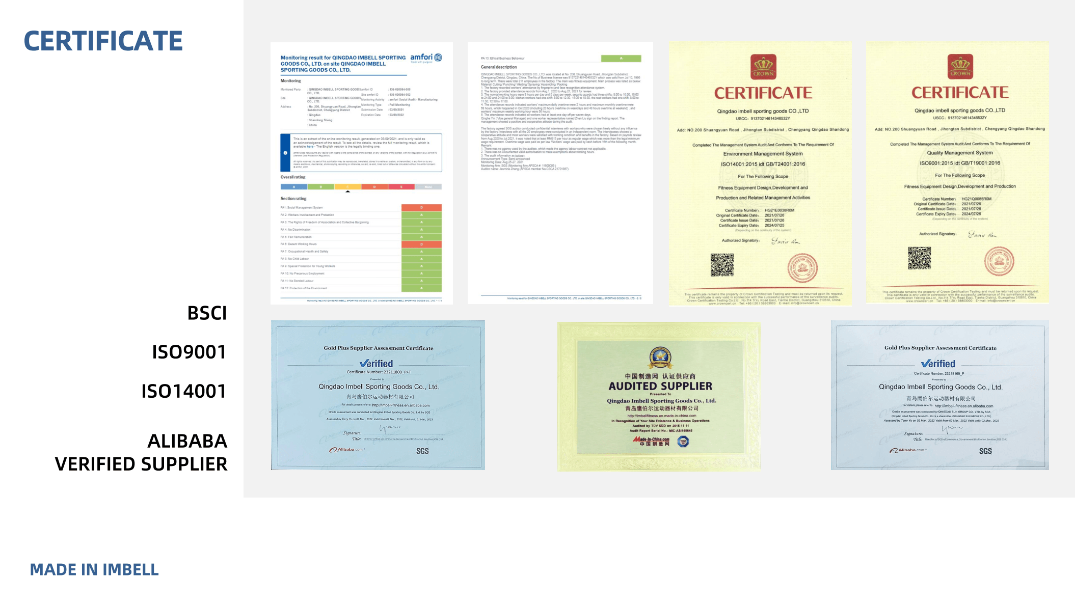 Certificate :ISO9001, ISO14001. Some products have passed EN957, GS, REACH, PAHs certification, National High-tech Enterprise, Shandong Gazelle Enterprise, Qingdao Enterprise Technology Center, Qingdao Industrial Design Center and other certificates.